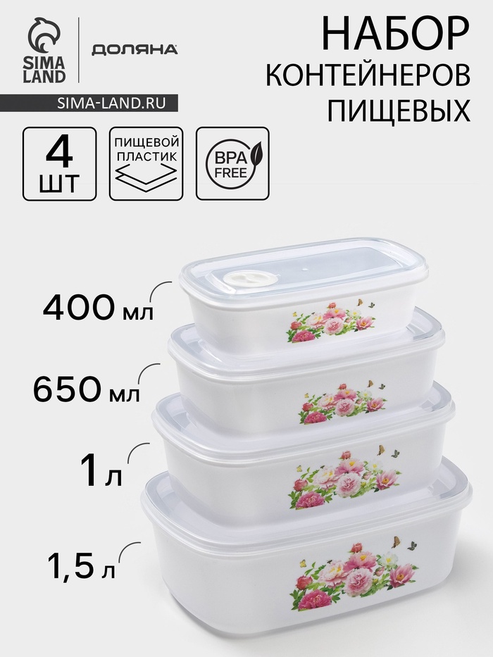 Контейнеры для еды с клапаном Доляна «Розы», набор 4 шт.: 400 мл, 650 мл, 1 л, 1.5 л, пластик, белые
