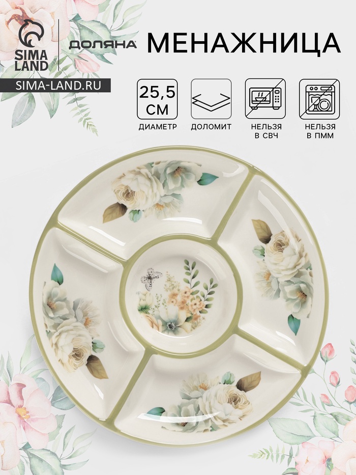 [Картинка122] Изящная менажница из доломита с нежным цветочным рисунком. Состоит из 5 удобных секций. Идеальна для сервировки закусок, соусов, оливок и других мелочей на праздничном столе. Диаметр 25.5 см.