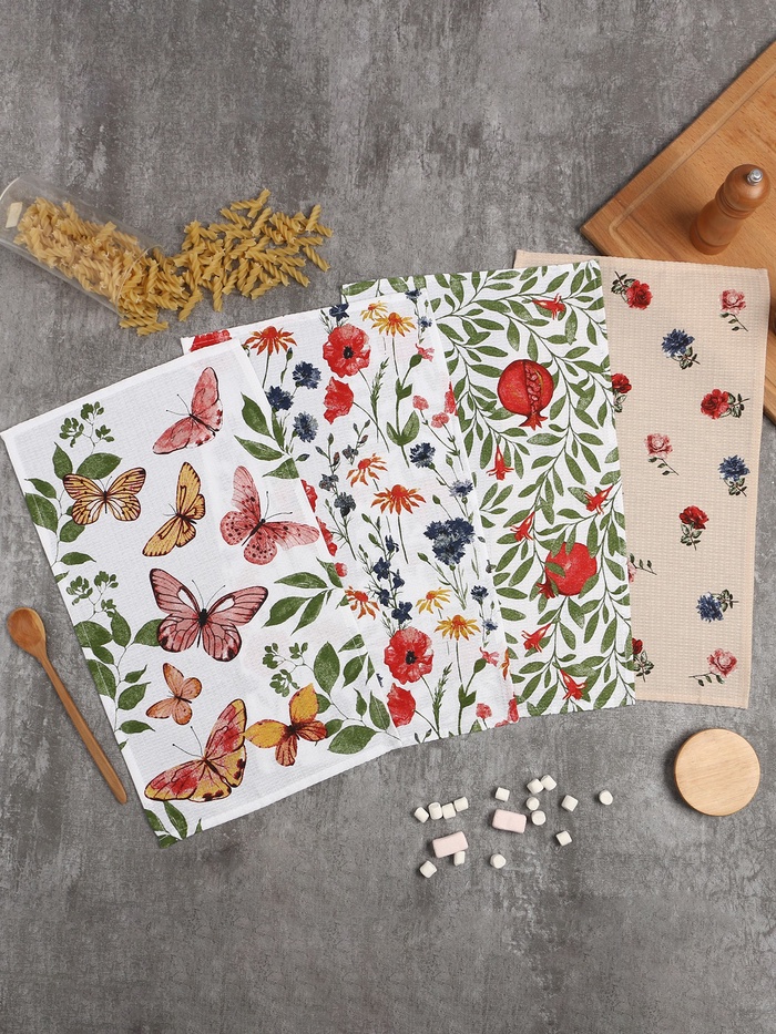 Набор из четырёх вафельных полотенец с цветочным принтом — это практичное и душевное дополнение для вашей кухни. Плотный хлопок вафельного переплетения быстро впитывает влагу и приятен для рук. Небольшой формат делает эти полотенца универсальными: для вытирания посуды, как салфетка под горячее или для сервировки завтрака.