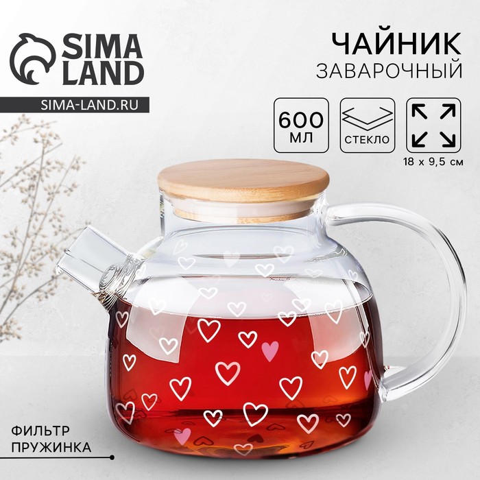 Чайник заварочный с бамбуковой крышкой «Сердечки», 600 мл