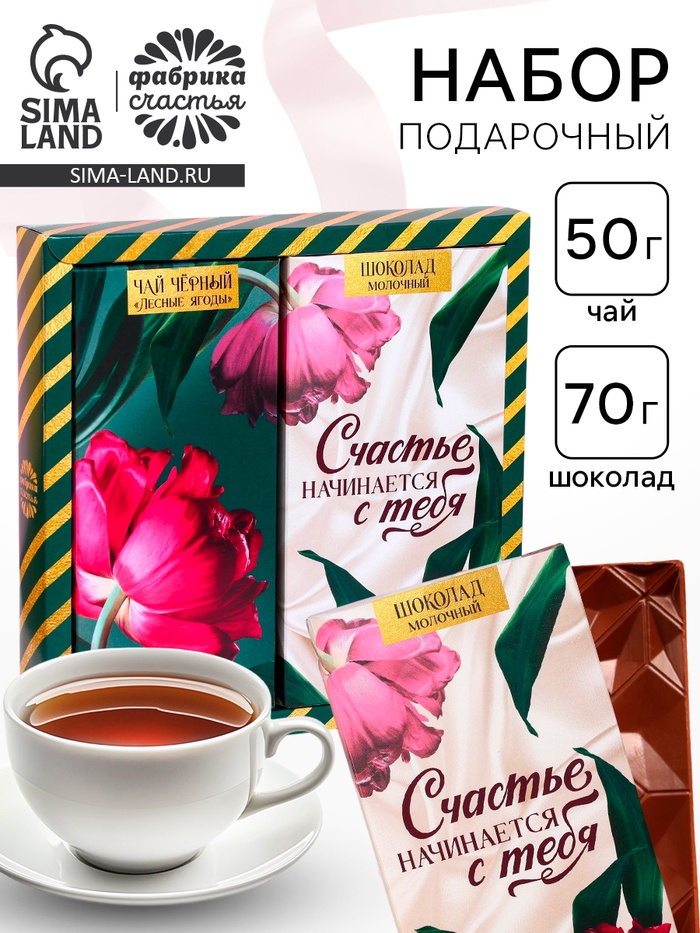 Подарочный набор «Счастье начинается с тебя»: чай чёрный с лесными ягодами 50 г, молочный шоколад 70 г