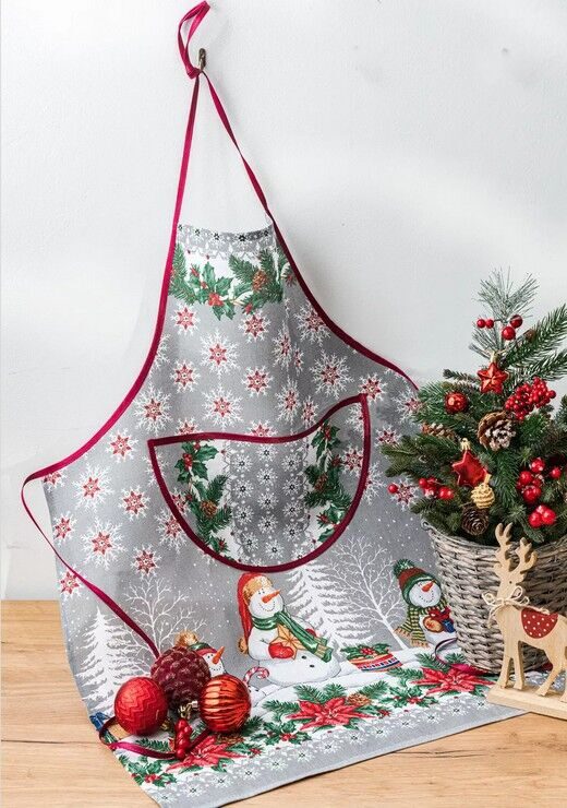 Фартук с карманом "Новогодние снеговики"-сер. рогожка хлопок 100%