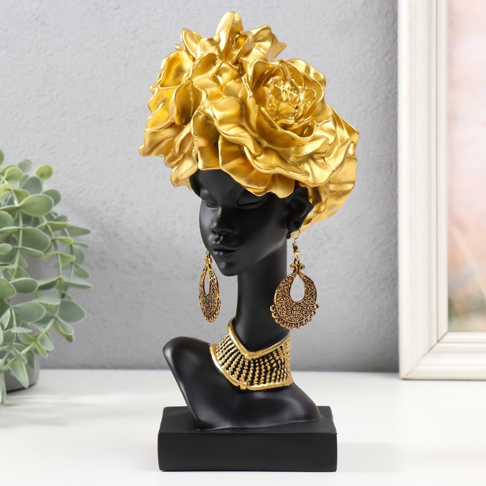 Фигурка полистоун «Бюст. Африканка с золотыми розами в волосах, с ожерельем», чёрный, 24×10×11 см