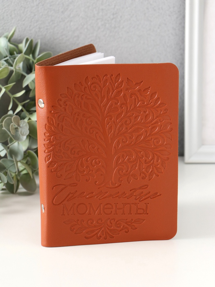 Храните самые дорогие воспоминания в стильном и практичном фотоальбоме, который сочетает в себе элегантность и функциональность. Его обложка из искусственной кожи благородного коричневого оттенка с теснением в виде дерева и надписью "Счастливые моменты" создаёт ощущение уюта и тепла.