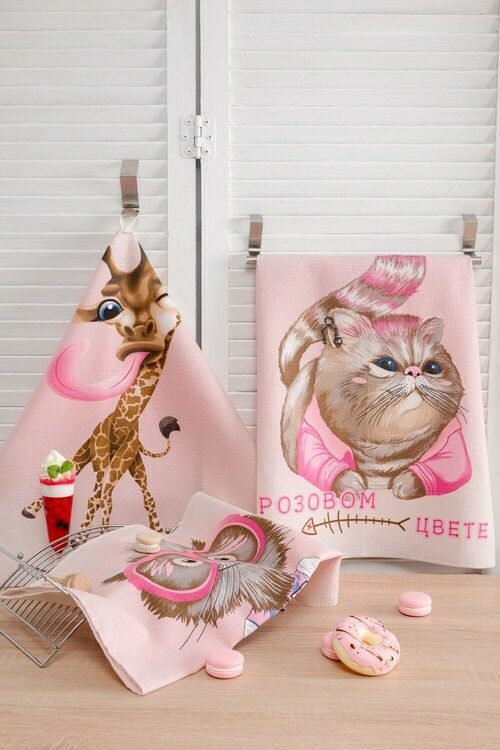 К-т полотенец "Розовый кот" 50*60 см. - 3 шт. вафля хлопок 100%
