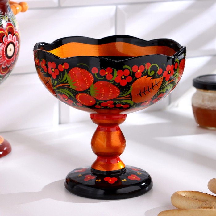 Конфетница на ножке «Земляничка», резная, дерево, хохлома