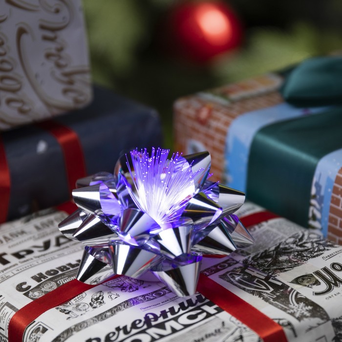 Светодиодная игрушка «Бант-звезда» размером 10 см воплощает праздничный стиль и декоративный блеск, сочетая серебристый корпус и перелив светодиодов. Многоцветное свечение создаёт эффект мерцающего подарка, который станет эффектным акцентом на ёлке, подарке или праздничной композиции.