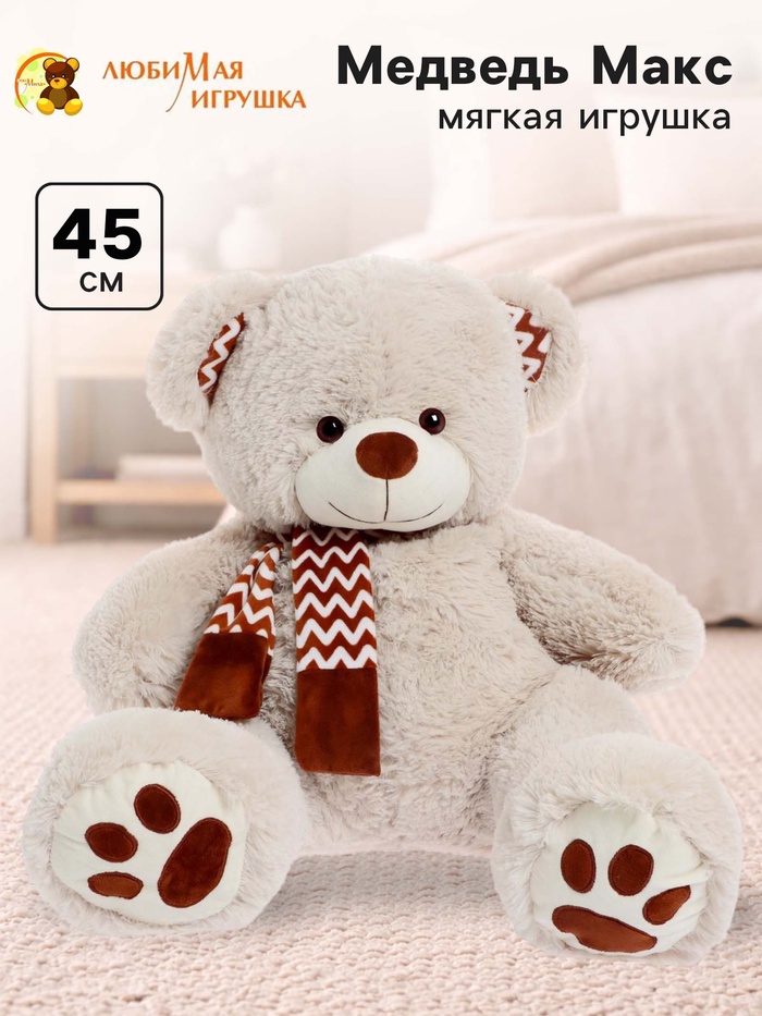 Мягкая игрушка «Медведь Макс» — уютный плюшевый медведь в светлом бежево-молочном оттенке с выразительными коричневыми акцентами. Образ дополняют шарф с геометрическим узором и декоративные вставки на лапках, которые придают игрушке аккуратный и законченный вид.
