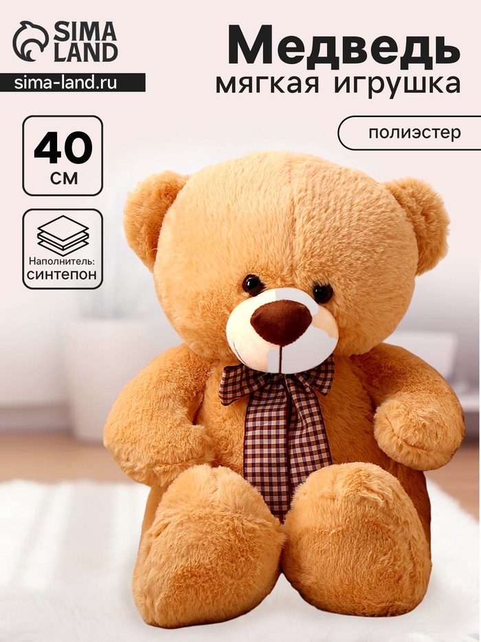 Мягкая игрушка «Медведь» — классический плюшевый медвежонок тёплого карамельного оттенка с аккуратным клетчатым бантом. Лаконичный дизайн и мягкая фактура делают его универсальным вариантом для подарка и уютного декора.