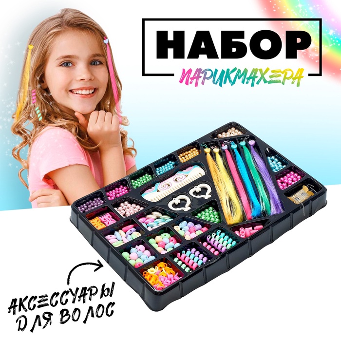 * В наборе есть всё для экспериментов — разноцветные пряди, бусины и аксессуары. Можно плести классические косы, добавлять украшения или придумывать собственные причёски.