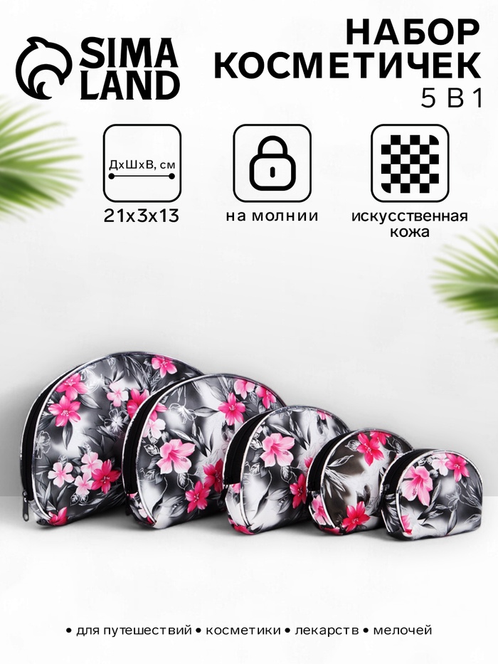 Набор женских косметичек 5 в 1 на молниях, с принтом, чёрный/серый
