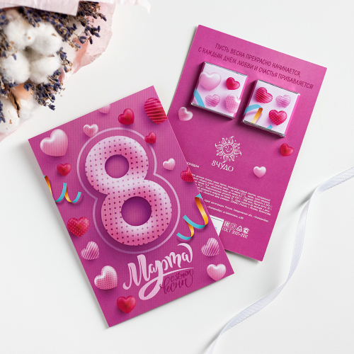 Открытка 2 шоколадки "8 марта, с праздником весны (сердечки на голубом фоне)" матовая