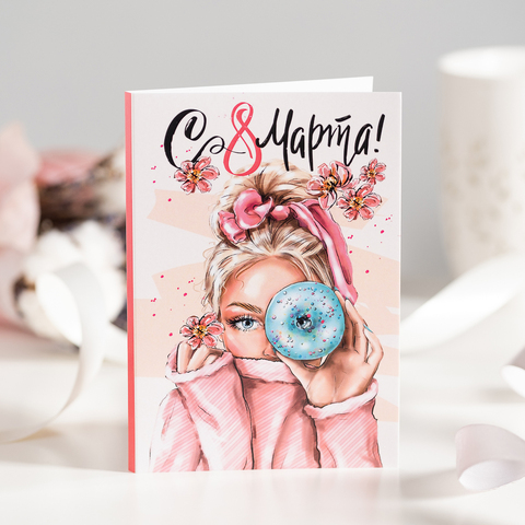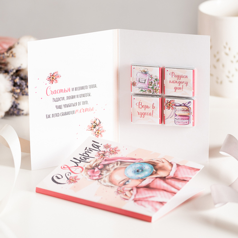 ● Открытка 4 шоколадки "С 8 марта (девушка с пончиком, розовая)"