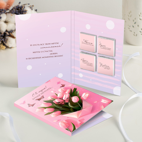 Открытка 4 шоколадки "С 8 марта! (тюльпаны розовая)"