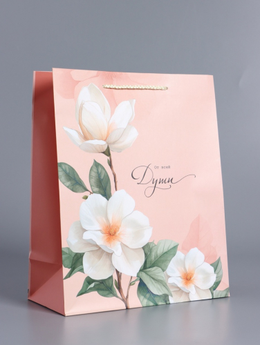 Самые тёплые чувства в каждой детали. Ламинированный подарочный пакет «От всей души» — это искренность, воплощённая в упаковке. Тёплый персиковый оттенок, нежные соцветия и главная надпись говорят о подарке, который выбран и подарен с особым чувством.