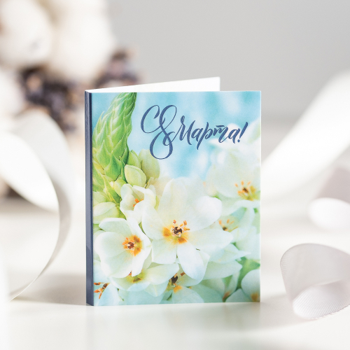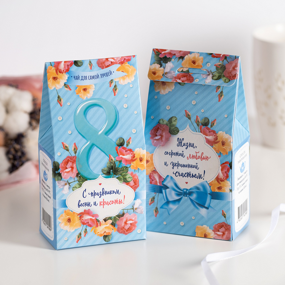 Подарочный чай-домик "С праздником весны и красоты (цифра 8 и цветы на голубом фоне)"