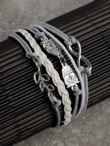 Браслет кожа «Магия знаков» совушки, 5 нитей, бело-серый, L=20 см