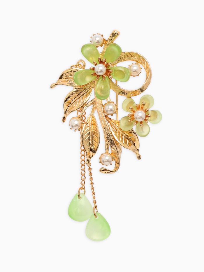 Брошь с жемчугом «Цветы», светло-зелёная в золоте