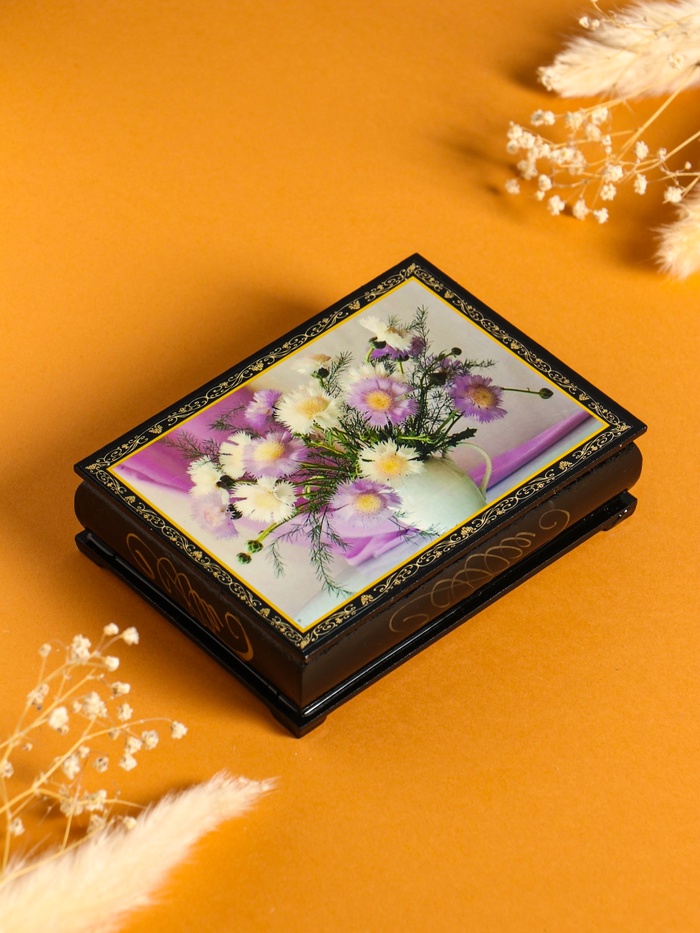 Храните изящные аксессуары в атмосфере искусства! Лаковая шкатулка «Цветы в кувшине» — это миниатюрная картина в формате изящной шкатулки для украшений. Она создает особое настроение, превращая хранение драгоценностей в эстетический ритуал.