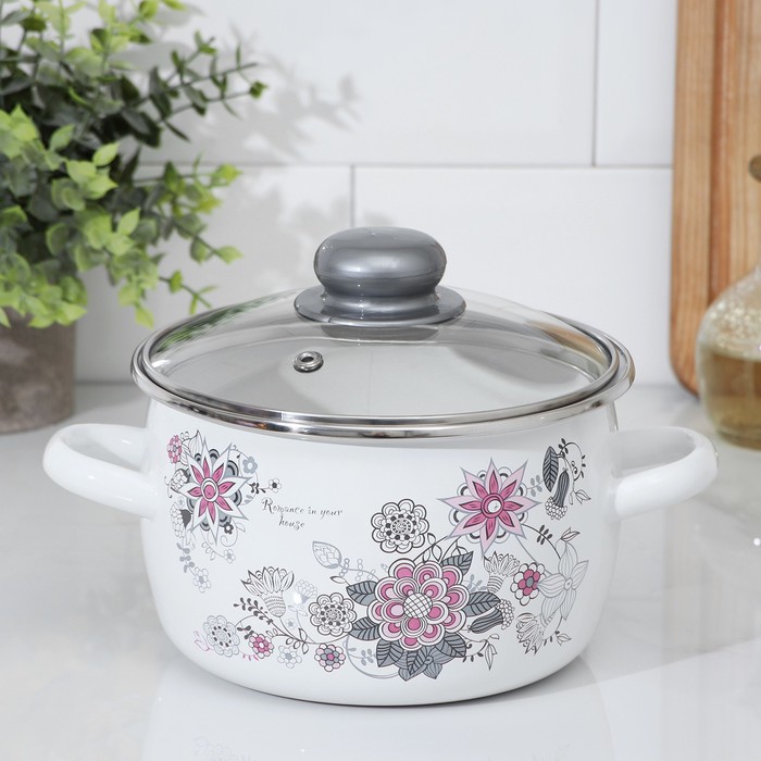 Кастрюля эмалированная «Весенний романс», 2 л, d=19 см, стеклянная крышка, индукция, цвет белый