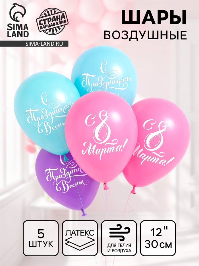 Воздушные шары латексные 12" «С 8 Марта!», 5 шт.