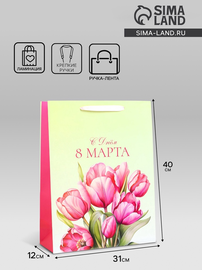 Пакет подарочный ламинированный вертикальный «С 8 Марта», L 31×40×12 см