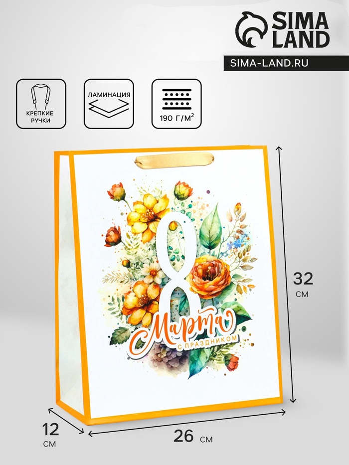 Пакет подарочный ламинированный вертикальный «С 8 Марта», M 26×32×12 см