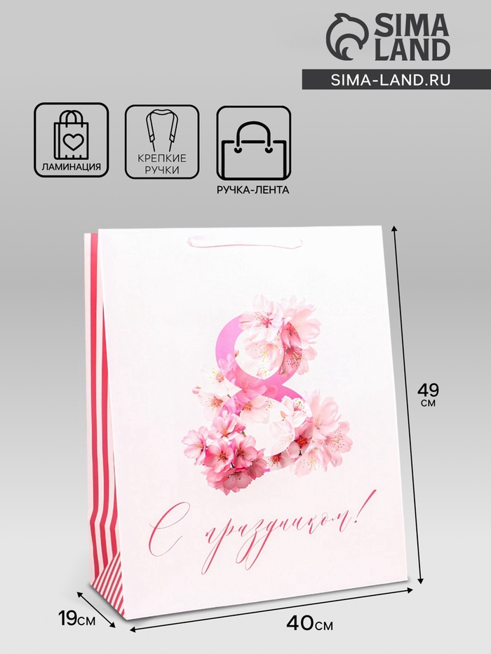 Пакет подарочный ламинированный вертикальный «С 8 Марта», XL 40×49×19 см