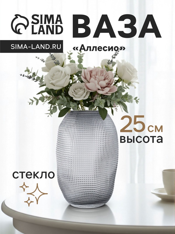 * Выразительный силуэт: Ваза высотой 25 см имеет интересную форму с широким основанием. Такая конструкция обеспечивает устойчивость даже с высоким букетом и визуально делает композицию объёмной и выразительной.