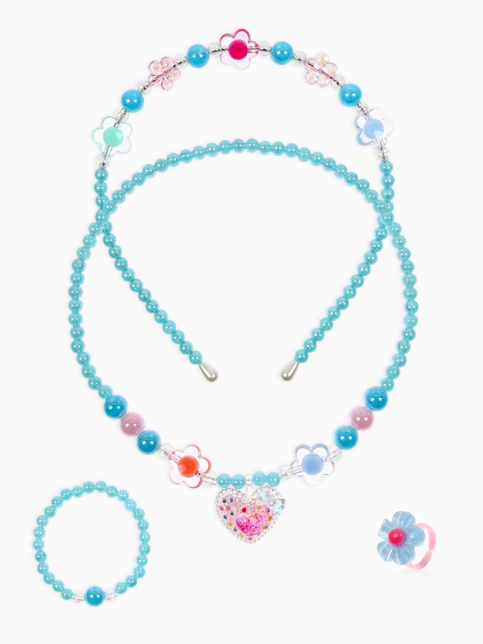 Набор включает четыре стильных элемента: клипсы, бусы, кольцо и ободок, выполненные в миксованных цветах, позволяющих сочетать разные оттенки и создавать самые оригинальные образы. Каждый элемент изготовлен из лёгкого и безопасного пластика, соответствующего стандартам экологичности и качества. Такое исполнение облегчает уход за украшениями и делает их безопасными для детской кожи.