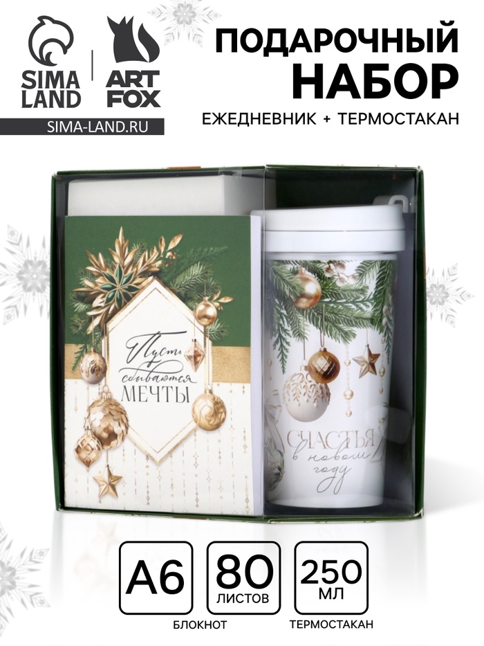 Подарочный набор новогодний, ежедневник, А6, 80 л., термостакан 250 мл «Пусть мечты сбываются»