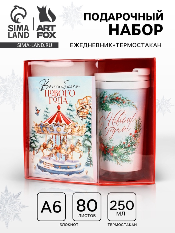 Подарочный набор новогодний, ежедневник А6, 80 листов, термостакан 250 мл «Карусель»
