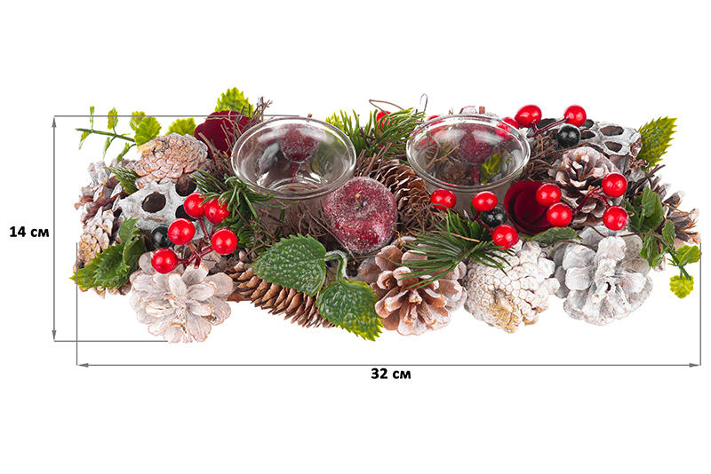 Новогоднее украшение-подсвечник «Снежная фантазия» от бренда Elan Gallery на 2 свечи станет изящным дополнением вашего интерьера. Размер изделия – 32х14х8 см, диаметр каждого подсвечника – 3,5 см. Глубокие ёмкости выполнены в форме классической чашечки и подойдут как для чайных свечей, так и для свечей-столбиков. Высокие стенки не допустят протечки воска. Необычное декоративное изделие представляет собой композицию из еловых веточек, шишек, искусственных ягод и яблочек. Мы создали коллекцию новогодних и рождественских товаров для сервировки и декора, которые наполнят пространство атмосферой уюта. Изделия помогут оформить интерьер праздничными композициями и добавят нотку зимнего волшебства. Поставьте подсвечник на стол, полку или подоконник, чтобы оно всегда было на виду и радовало глаз. Сделайте частью праздничного стола, чтобы привнести ощущение чуда. Зажгите свечу и насладитесь неторопливым вечером в компании книг, фильма или душистого напитка, чтобы отдохнуть. Необычный элемент декора найдёт место в любой части вашей квартиры: в прихожей, гостиной, столовой или спальне. Это изящный и лёгкий способ добавить эстетики любому помещению. Поставляется в картонной коробке. В коллекции бренда Elan Gallery представлены посуда, сувениры и украшения с новогодней символикой. Каждый подберёт оригинальный сюрприз для семьи, друзей и коллег на Новый год и Рождество. Такой подарок наполнит дом семейным теплом и духом праздника!
