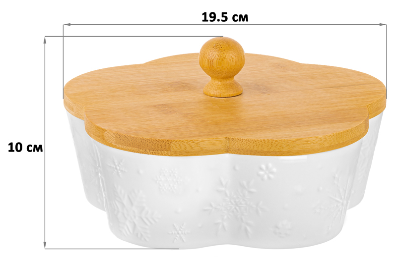 Банка для печенья из серии «Снежинки» от Elan Gallery предназначена для эстетичной сервировки вашего стола. Размер изделия – 19,5х19,5х10 см, объём – 900 мл. Выполнена из высококачественного белого фарфора в форме цветка и украшена рельефным узором в виде снежинок. Крышка выполнена из натурального бамбука. Фарфор легко отмывается и не впитывает цвет продуктов, благодаря чему надолго сохранит свою белизну. Мы создали коллекцию новогодних и рождественских товаров для сервировки и декора, которые наполнят пространство атмосферой уюта. Изделия помогут оформить интерьер праздничными композициями и добавят нотку зимнего волшебства. Красивая ёмкость в форме цветка станет не только функциональным, но и эстетичным дополнением вашего кухонного инвентаря. Наполните баночку любимым печеньем, конфетами, рождественскими пряниками и любыми другими сладостями и выпечкой. Наполните разнообразными десертами, чтобы разделить угощение с семьёй и друзьями. Используйте для подачи закусок: ягод, орехов или фруктов. Наполните их дольками мандаринов, чтобы привнести в дом праздничную атмосферу. Подойдёт для хранения сыпучих продуктов: кофе, сахара и соли, специй и приправ. Крышка сервировочной баночки имеет свободную посадку, чтобы её было легко и быстро открывать. Не рекомендуется применять абразивные моющие средства. Без бамбуковой крышки подходит для использования в посудомоечной машине и микроволновой печи. Бамбук нельзя замачивать! Поставляется в дизайнерской картонной коробке – благодаря ей вам не потребуется дополнительная подарочная упаковка. В коллекции бренда Elan Gallery представлены посуда, сувениры и украшения с новогодней символикой. Каждый подберёт оригинальный сюрприз для семьи, друзей и коллег на Новый год и Рождество. Такой подарок наполнит дом семейным теплом и духом праздника!