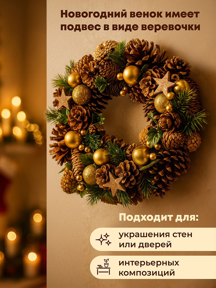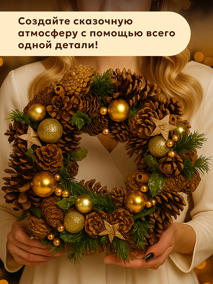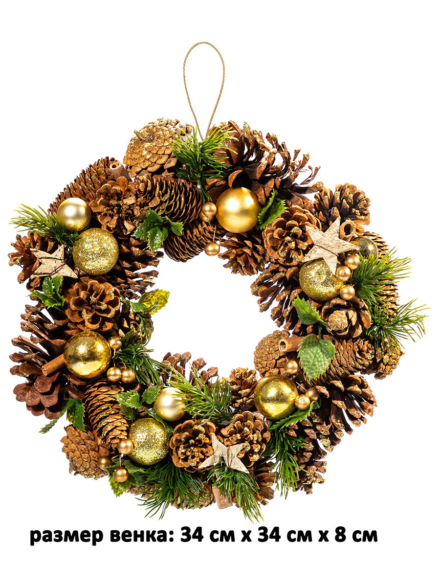 Декоративное украшение в виде венка "Новогодний лес" от бренда Elan Gallery размером 34х34х8 см подарит атмосферу сказки и волшебства вашему дому или офису! Ведь создание праздничной атмосферы начинается с украшения домашнего или офисного интерьера. Композиция из искусственных еловых веточек с золотыми новогодними шарами и декором в виде ягод притягивает взгляд гостей на вечеринке с первой минуты. Имеет круглую основу из пенопласта и петлю для подвешивания из джута. Мы создали коллекцию новогодних и рождественских товаров для сервировки и декора, которые наполнят пространство атмосферой уюта. Изделия помогут оформить интерьер праздничными композициями и добавят нотку зимнего волшебства. Венок на прочной основе украшен настоящими сосновыми шишками. Просто повесьте его дома на стену, чтобы превратить в праздник самый обычный день. Украсьте им входную дверь, придавая ей праздничный вид, чтобы тепло поприветствовать гостей. Можно использовать как настенный или настольный декор в любом помещении. С венком можно создать декоративную композицию на камине, столе или дверце. Оформление комнаты веночками подарит уютную рождественскую атмосферу на празднике или семейном ужине. В коллекции бренда Elan Gallery представлены посуда, сувениры и украшения с новогодней символикой. Каждый подберёт оригинальный сюрприз для семьи, друзей и коллег на Новый год и Рождество. Такой подарок наполнит дом семейным теплом и духом праздника!