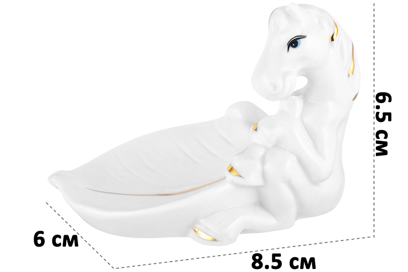 Подставка для украшений «Лошадь» от Elan Gallery поможет организовать эстетичную систему хранения ювелирных изделий и бижутерии. Размер изделия – 8,5х6х6,5 см. Выполнена из высококачественного белого фарфора. Он не впитывает посторонние цвета и легко отмывается, благодаря чему надолго сохранит свою белизну. Представляет собой фигурку в виде маленькой лошади, сидящей возле лотка в виде листка. Изделие украшено золотистыми элементами. Лошадь – символ 2026 года! Её образ отражает энергию, свободу и неукротимый дух, вдохновляя на преодоление любых преград. Мы создали коллекцию новогодних и рождественских товаров для сервировки и декора, которые наполнят пространство атмосферой уюта. Изделия помогут оформить интерьер праздничными композициями и добавят нотку зимнего волшебства. Используйте милый держатель для колец из золота и серебра, для серёжек и цепочек. Сложите золотые браслеты, цепочки и кулоны. Органайзер также подойдёт для аксессуаров для волос – разнообразных заколок и резинок. В прихожей он поможет хранить небольшие брелоки и другие декоративные изделия. Это оригинальное дополнение хозяйственного инвентаря, которое поможет девушкам с организацией порядка в своей коллекции украшений! Благодаря необычному дизайну стильная настольная статуэтка выступит и самостоятельным элементом декора – она найдёт место в любой части вашего дома. Не рекомендуется применять абразивные моющие средства. Не подходит для использования в посудомоечной машине. Поставляется в яркой картонной коробке – благодаря ей вам не потребуется дополнительная подарочная упаковка. В коллекции бренда Elan Gallery представлены подарочные аксессуары, сувениры и украшения с символикой коней и лошадок. Каждый подберёт оригинальный сюрприз для семьи, друзей и коллег на Новый год и Рождество. Такой подарок наполнит дом семейным теплом и духом праздника!