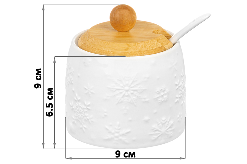 Банка из серии «Снежинки» от Elan Gallery послужит для организации хранения сыпучих продуктов на вашей кухне. Размер ёмкости – 8,5х8,5х9 см, объём – 250 мл. Выполнена из высококачественного белого фарфора. Он не впитывает цвет продуктов и легко отмывается, благодаря чему надолго сохраняет свою белизну. Поверхность изделия украшают рельефные узоры в виде снежинок. Крышка выполнена из натурального бамбука. Поставляется в комплекте с фарфоровой ложкой длиной 12,5 см. Мы создали коллекцию новогодних и рождественских товаров для сервировки и декора, которые наполнят пространство атмосферой уюта. Изделия помогут оформить интерьер праздничными композициями и добавят нотку зимнего волшебства. Ёмкость подойдёт для хранения разнообразных сыпучих продуктов. Заполните её сахаром и солью, специями и приправами, чтобы во время приготовления и приёма пищи всё необходимое было под рукой. Засыпьте внутрь чай или кофе, чтобы в любой момент заварить свежий напиток. Храните в ней крупы и макаронные изделия, ягоды, орехи и сухофрукты. Заполните контейнер сладостями и закусками: конфетами, леденцами, пряниками или печеньем. Подайте баночку к столу, чтобы идеально дополнить чайную сервировку! Герметичная бамбуковая крышечка защитит ваши продукты от попадания грязи и пыли. Не рекомендуется применять абразивные моющие средства. Без бамбуковой крышки подходит для использования в посудомоечной машине и микроволновой печи. Бамбук нельзя замачивать! Поставляется в дизайнерской картонной коробке – благодаря ей вам не потребуется дополнительная подарочная упаковка. В коллекции бренда Elan Gallery представлены посуда, сувениры и украшения с новогодней символикой. Каждый подберёт оригинальный сюрприз для семьи, друзей и коллег на Новый год и Рождество. Такой подарок наполнит дом семейным теплом и духом праздника!