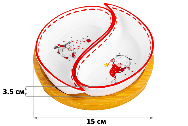 Тарелка под оливки из серии «Весёлые гномики» от Elan Gallery подойдёт для эстетичной сервировки вашего стола. Общий размер изделия – 15х15х3,5 см. Размер каждой ёмкости – 14х7х2,5 см, объём – 100 мл. Выполнена из высококачественного белого фарфора. Он не впитывает цвет продуктов и легко отмывается, благодаря чему надолго сохраняет свою белизну. Поверхность изделий украшает яркий рисунок в виде забавных гномиков. Мы создали коллекцию новогодних и рождественских товаров для сервировки и декора, которые наполнят пространство атмосферой уюта. Изделия помогут оформить интерьер праздничными композициями и добавят нотку зимнего волшебства. Подставка выполнена из натурального бамбука. Размер – 15х15х1 см. Менажница поможет красиво подавать маслины, орехи или сыры. Она станет незаменимым элементом праздничных обедов или неторопливых завтраков. Послужит в качестве конфетницы, позволив угостить себя и гостей любимыми сладостями: конфетами, мармеладом, леденцами и безе. Фарфоровая посуда с изображением маленьких новогодних помощников привнесёт в любое помещение дух волшебства и праздника! Это оригинальный элемент вашего декора. Не рекомендуется применять абразивные моющие средства. Без бамбуковой подставки подходит для использования в посудомоечной машине и микроволновой печи. Бамбук нельзя замачивать! Поставляется в дизайнеркой картонной коробке – благодаря ей вам не потребуется дополнительная подарочная упаковка. В коллекции бренда Elan Gallery представлены посуда, сувениры и украшения с новогодней символикой. Каждый подберёт оригинальный сюрприз для семьи, друзей и коллег на Новый год и Рождество. Такой подарок наполнит дом семейным теплом и духом праздника!