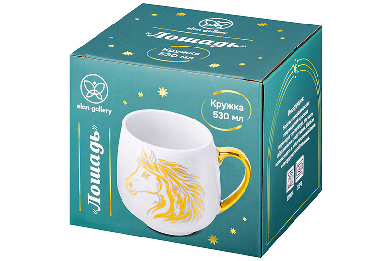 Кружка «Лошадь» от Elan Gallery предназначена для эстетичной сервировки вашего стола. Размер ёмкости – 13,5х10,5х10,7 см, объём – 530 мл. Выполнена из высококачественного белого фарфора. Он не впитывает цвет напитков и легко отмывается, благодаря чему надолго сохранит свою белизну. Поверхность изделия украшает рисунок в виде золотистой лошади. Золотистая ручка служит дополнительным акцентом. Лошадь – символ 2026 года! Её образ отражает энергию, свободу и неукротимый дух, вдохновляя на преодоление любых преград. Мы создали коллекцию новогодних и рождественских товаров для сервировки и декора, которые наполнят пространство атмосферой уюта. Изделия помогут оформить интерьер праздничными композициями и добавят нотку зимнего волшебства. Кофейная кружка поможет вам провести множество приятных завтраков с капучино и латте, а также уютные чайные вечера с конфетами, вафлями и другими сладостями. Подойдёт ценителям чая и кофе, которые любят пить из красивой и необычной посуды. Согрейтесь зимой любимым напитком: какао с маршмэллоу, ягодным чаем, горячим шоколадом или глинтвейном. Летом освежитесь домашним лимонадом или морсом. Это эффектный подарок на любой праздник, в том числе на Новый год или Рождество. Не рекомендуется применять абразивные моющие средства. Не подходит для использования в посудомоечной машине и микроволновой печи. Поставляется в дизайнерской картонной коробке – благодаря ей вам не потребуется дополнительная подарочная упаковка. В коллекции бренда Elan Gallery представлены подарочные аксессуары, сувениры и украшения с символикой коней и лошадок. Каждый подберёт оригинальный сюрприз для семьи, друзей и коллег на Новый год и Рождество. Такой подарок наполнит дом семейным теплом и духом праздника!