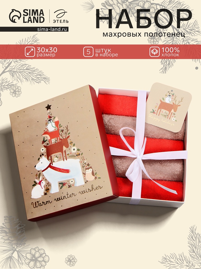 Набор махровых полотенец «Этель. Звериная ёлка», 30×30 см - 5 шт., хлопок 100%