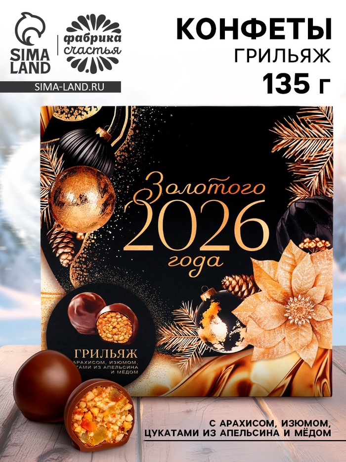 Конфеты шоколадные грильяж «Новый год 2026» с арахисом, изюмом, цукатами из апельсина и мёдом, в коробке, 135 г