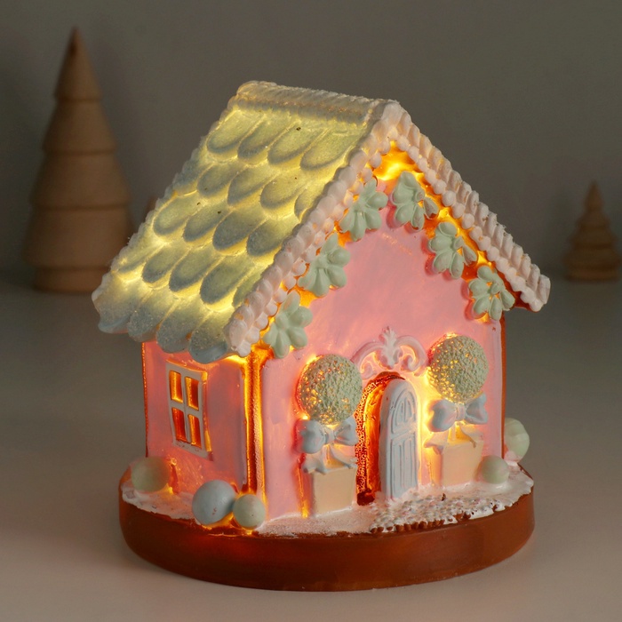 Представьте себе уголок зимней сказки, который помещается на ладони — именно такое ощущение дарит этот светящийся пряничный домик. Выполненный в нежном розовом оттенке с элементами зелени, он воплощает уют шебби-шика и теплоту домашнего очага.