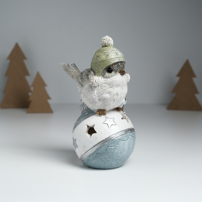 В уютном мире зимних чудес найдется место и для самых маленьких обитателей. Эта светящаяся фигурка воробышка в теплой шапке, устроившегося на новогоднем шаре, словно сошла со страниц скандинавской сказки. Она напоминает о том, что праздник живет в каждом мгновении, даже в тихой минутке отдыха маленькой птички.