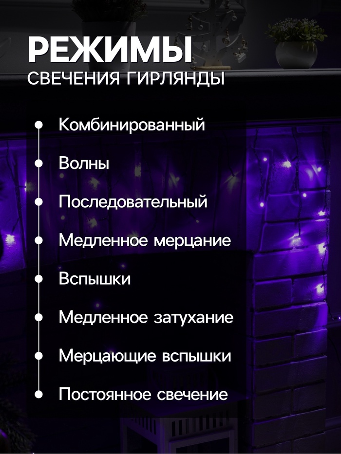 Гирлянда «Бахрома» 1.8×0.5 м, IP20, тёмная нить, 48 LED, свечение фиолетовое, 8 режимов, 220 В