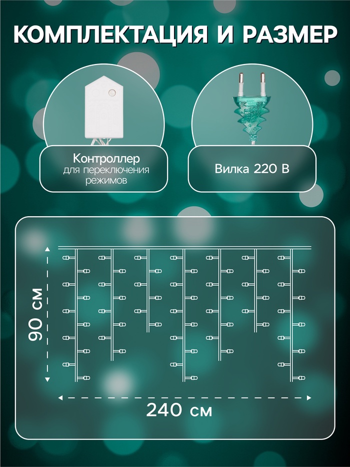 Гирлянда «Бахрома» 2.4×0.9 м с насадками «Снежинки», IP20, прозрачная нить, 150 LED, свечение мульти, 8 режимов, 220 В