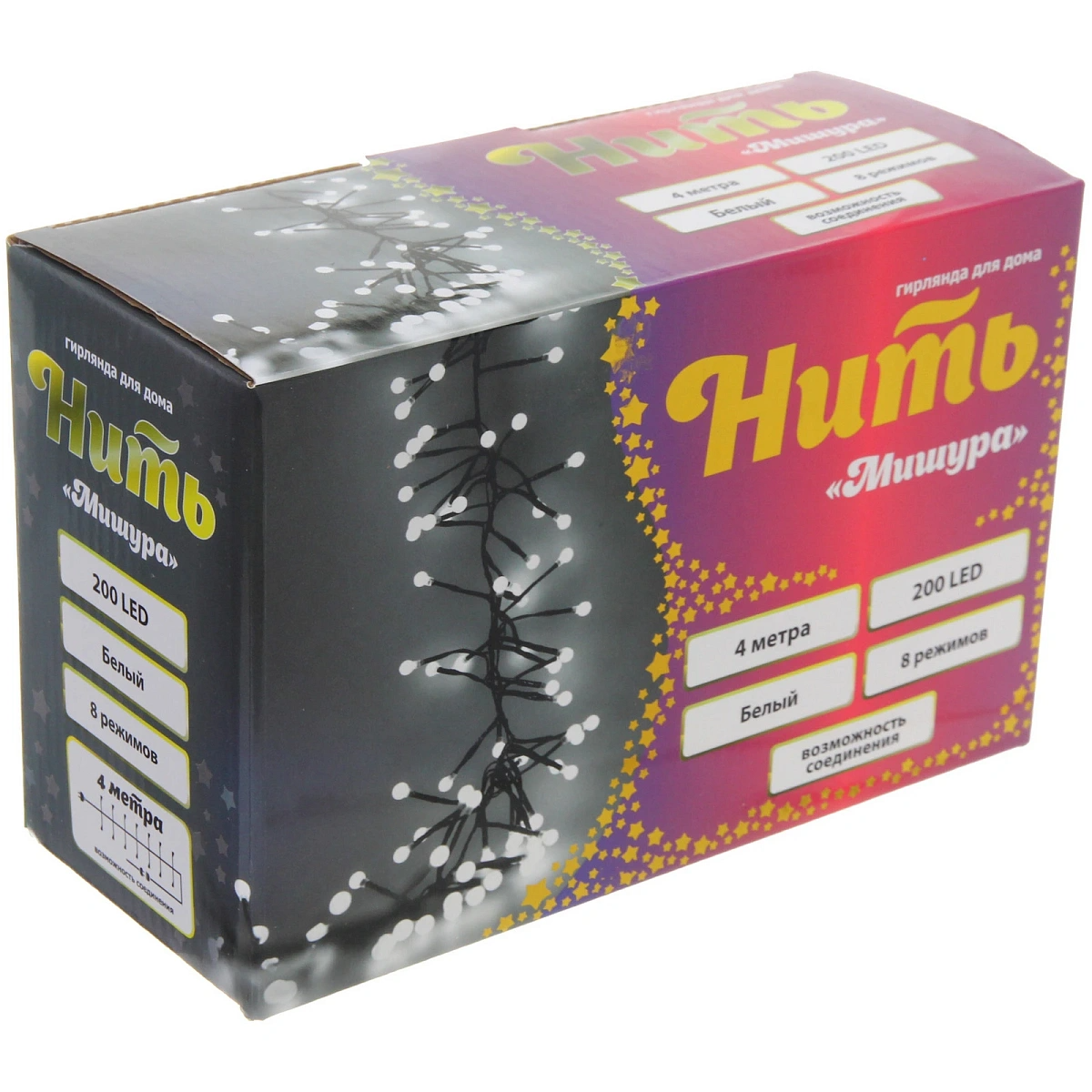 Гирлянда для дома Мишура 4 м, 200 ламп LED, d-1,4 см, черный пров, 8 реж, IP-40, Белый (возможность соединения)