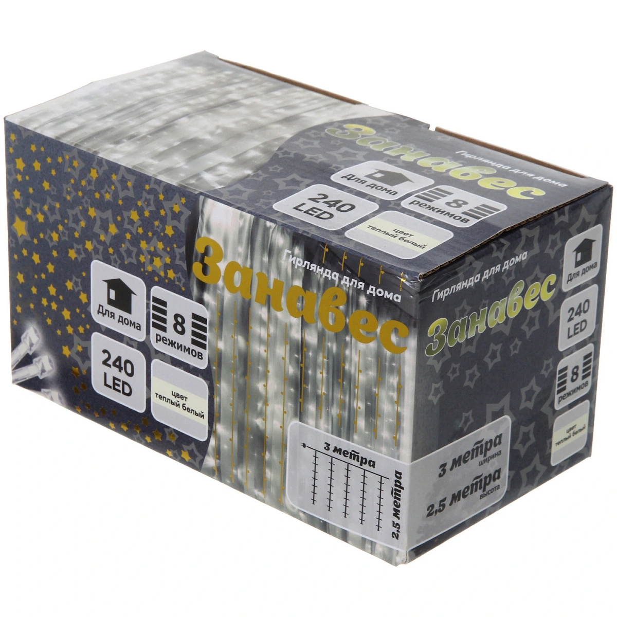 Гирлянда для дома ЗАНАВЕС 3м*2,5м 240 ламп LED, прозр.провод, 8 реж., IP-20. Теплый белый