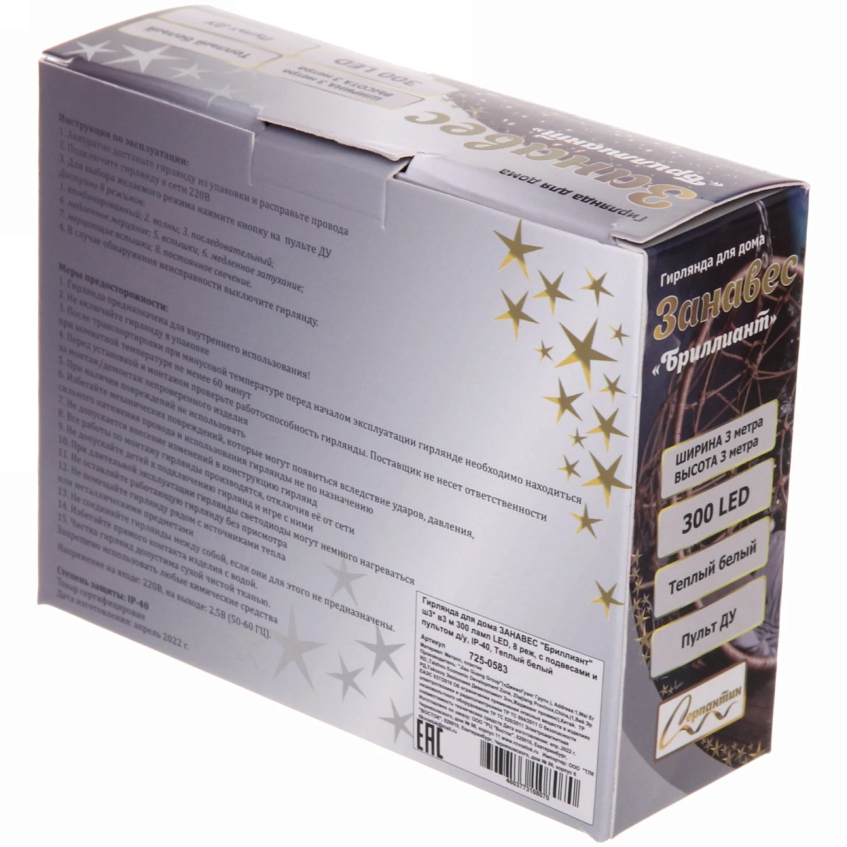 Гирлянда для дома ЗАНАВЕС "Бриллиант" ш3* в3 м 300 ламп LED, 8 реж, с подвесами и пультом д/у, IP-40, Теплый белый