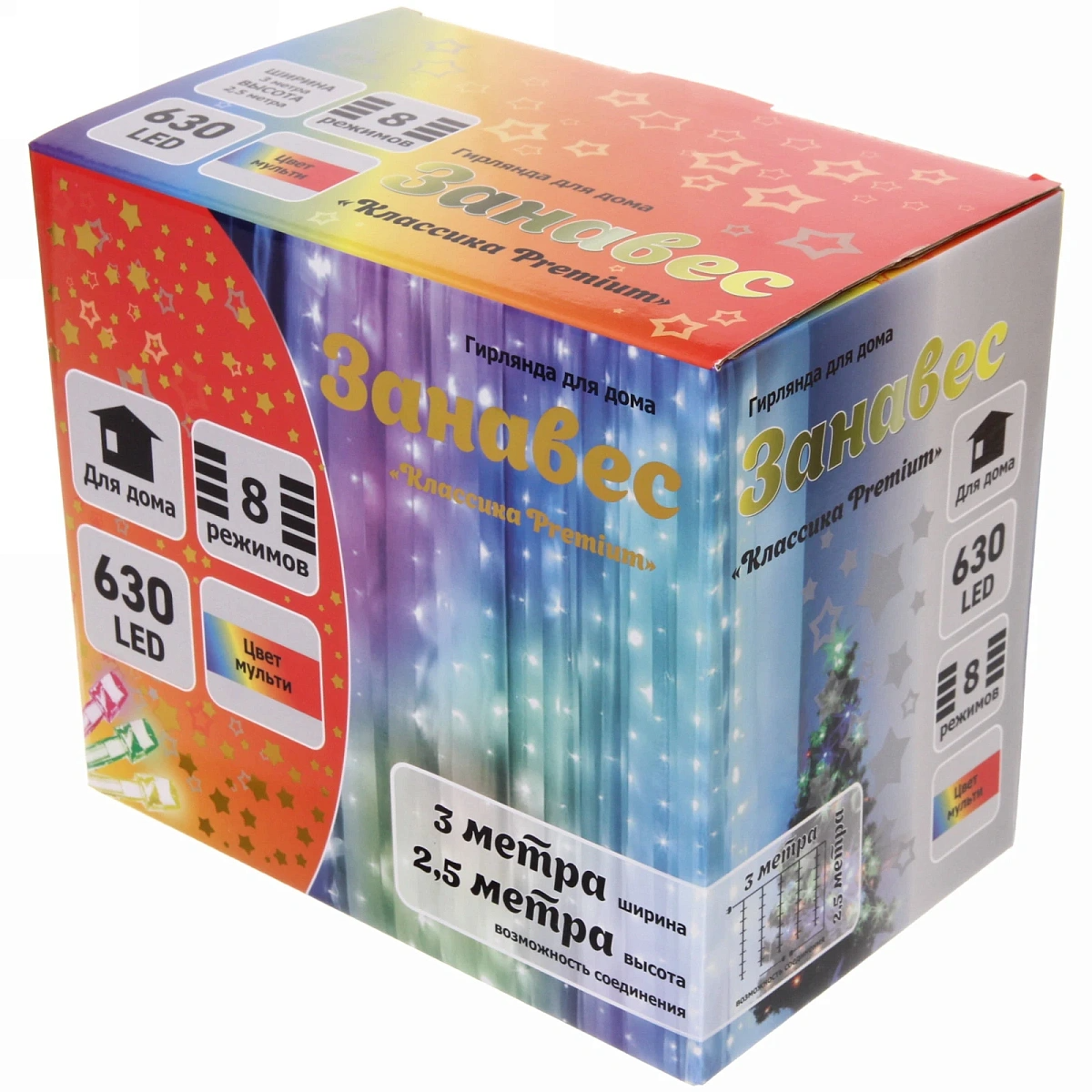 Гирлянда д/дома ЗАНАВЕС"Классика Premium"ш3*в2,5м 630лампLED,пр пров,8 реж,IP-40.Мультицвет (соединение)