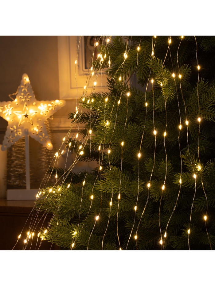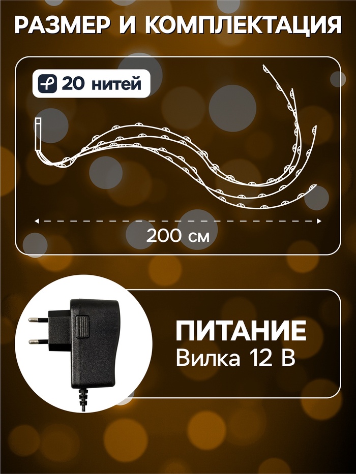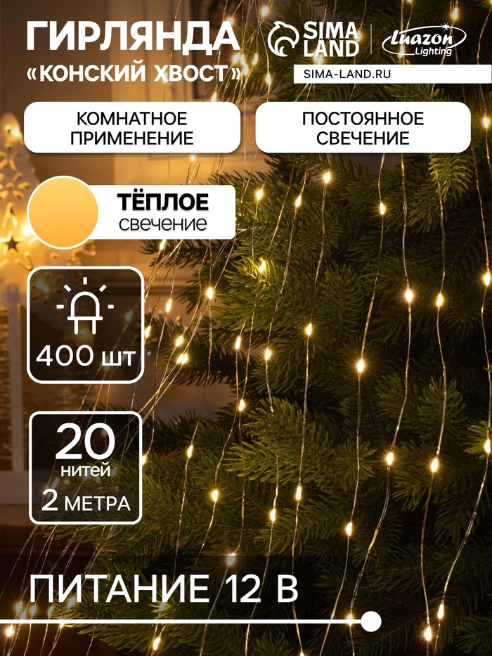 Гирлянда «Конский хвост» 20 нитей по 2 м, IP20, серебристая нить, 400 LED, свечение тёплое белое, 12 В